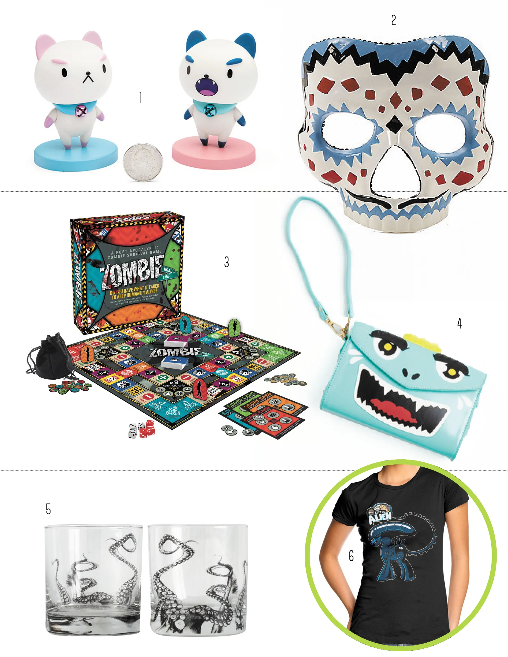 4. Monster purse // 5. Tentacle glassware // 6. My Little Alien t-shirt